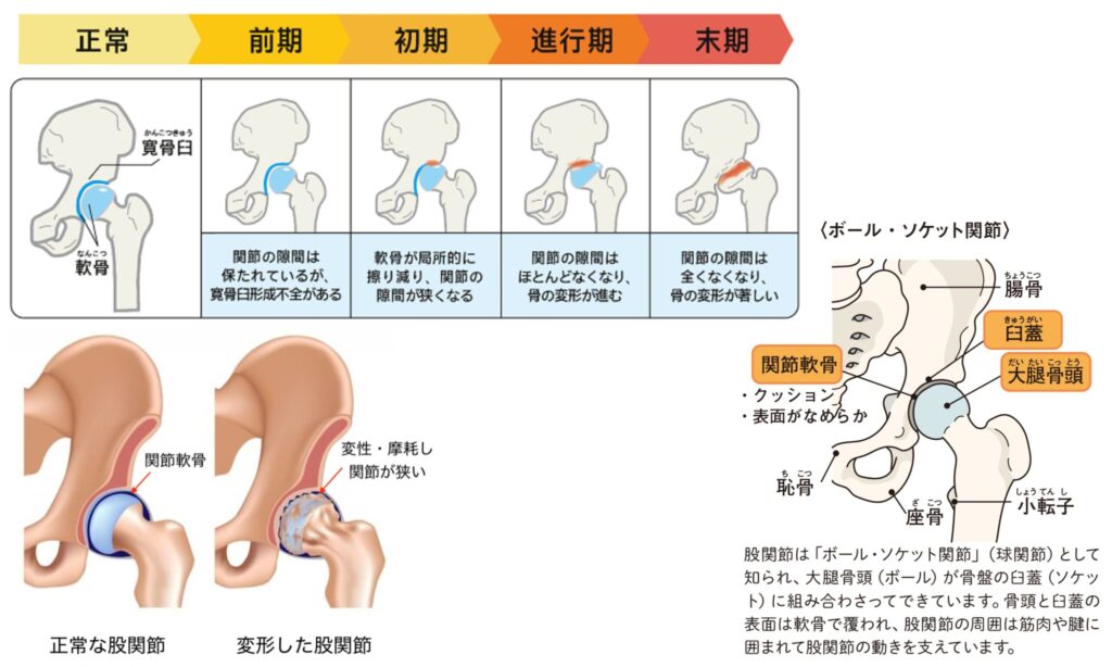 ・股関節の軟骨がすり減り、骨棘が形成され、関節が変形