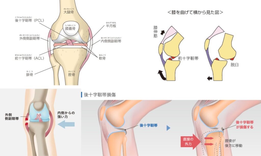| 後十字靭帯 | 膝の後方移動を防ぐ | 膝を強打したときに損傷(交通事故など)。 |